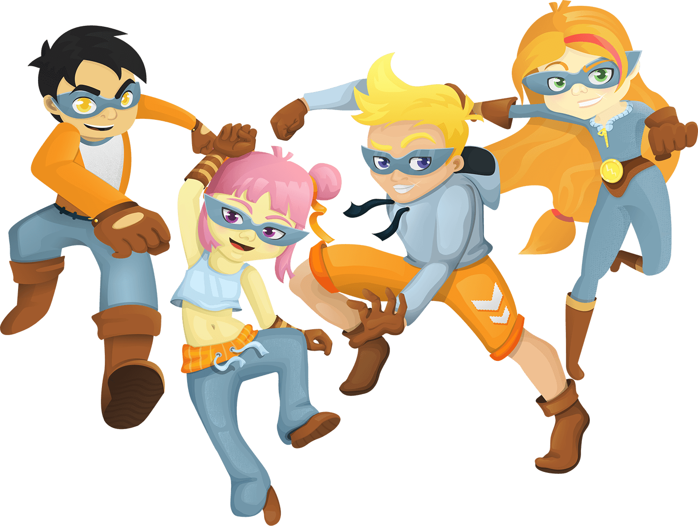 Poniżej znajdziesz cztery karty ze Zdobywcami Wiedzy – każdy bohater reprezentuje inny przedmiot. Kliknij wybraną kartę, aby przejść do ćwiczeń demo z języka polskiego, matematyki, przyrody lub języka angielskiego.